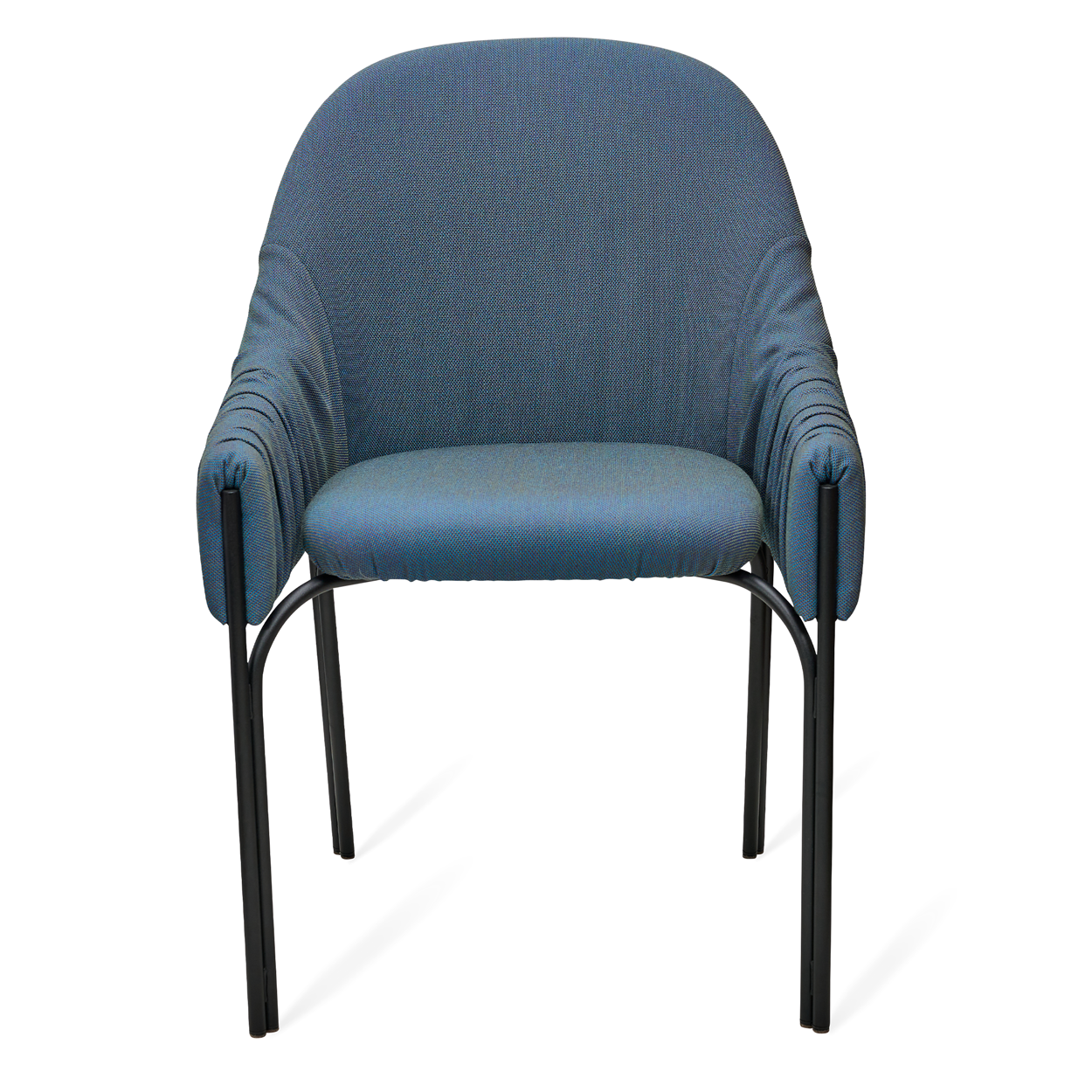 Das markante Design dieses Modells zeichnet sich durch den harmonischen Kontrast zwischen dem straff und gleichzeitig lebendig wirkenden Material aus. Der geschickte Einsatz von Faltenwürfen schafft eine visuelle Leichtigkeit, während die straff bezogene Sitzfläche und die schlanken Beine des Stuhls eine klare, elegante Linienführung bieten.
