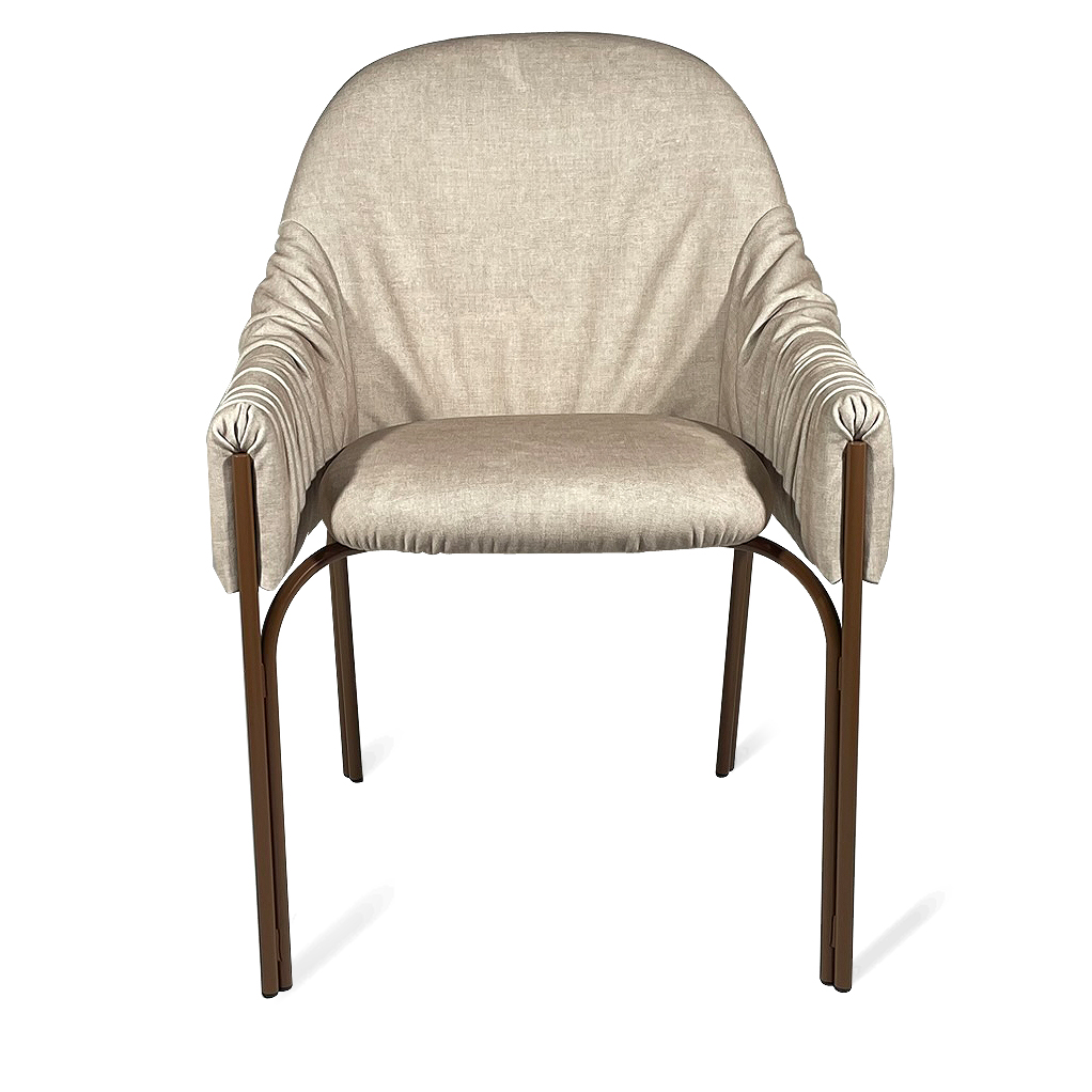 Charakteristisch bei diesem Modell ist der Übergang von straffem zu gerafftem Material und gibt dadurch dem Stuhl eine wundervolle Spannung. Der opulente Faltenwurf strahlt Leichtigkeit aus, wobei die straff bezogene, freischwebende Sitzfläche und die filigranen Stuhlbeine eine konsequente Linienführung zeigen.