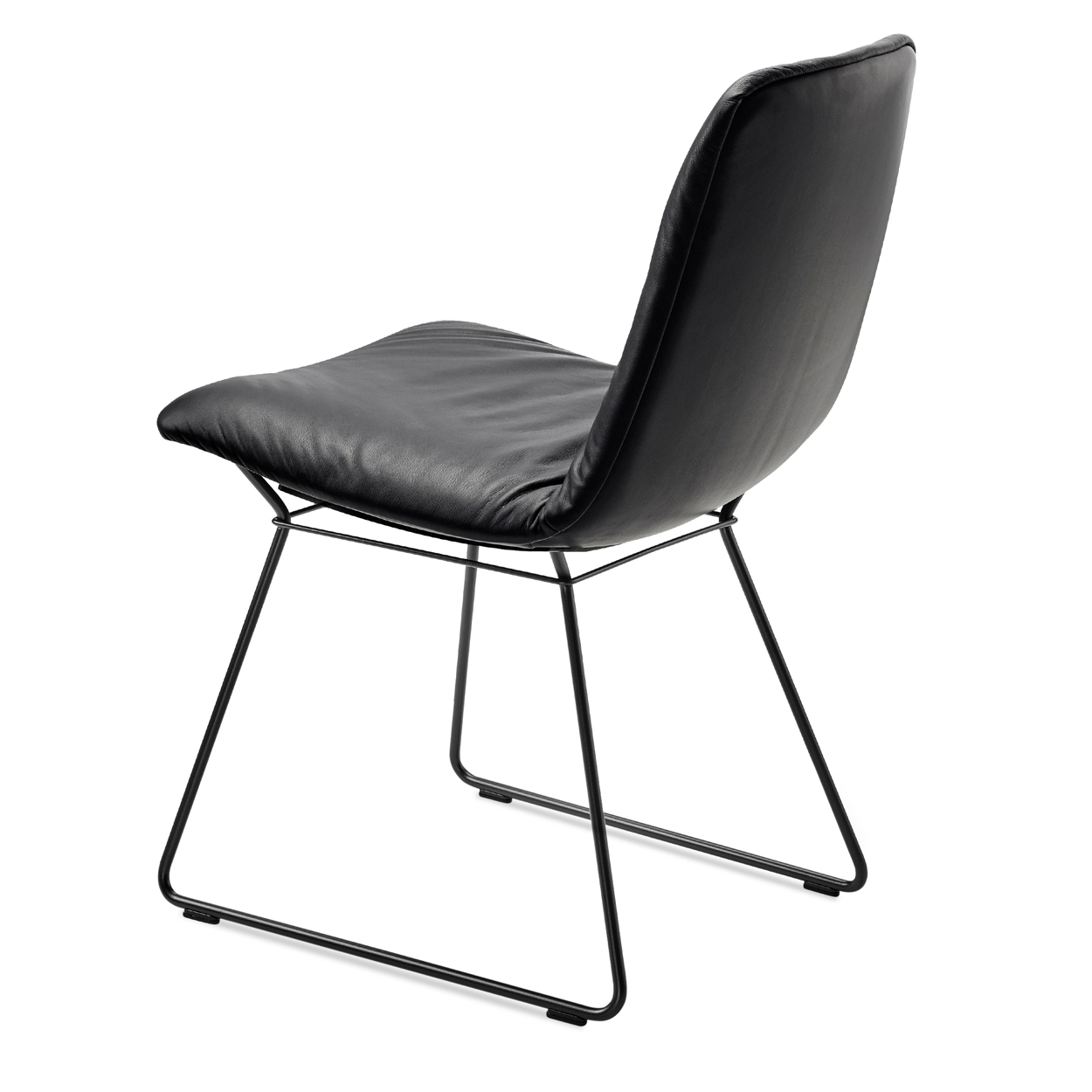 Das filigrane Drahtgestell in Tiefschwarz setzt einen eleganten Kontrast zum Leder und verleiht dem Design eine zeitlose Note. Zudem gewährleisten Filz-Stuhlgleiter den Schutz Ihres Bodens und erleichtern das mühelose Verschieben des Stuhls.