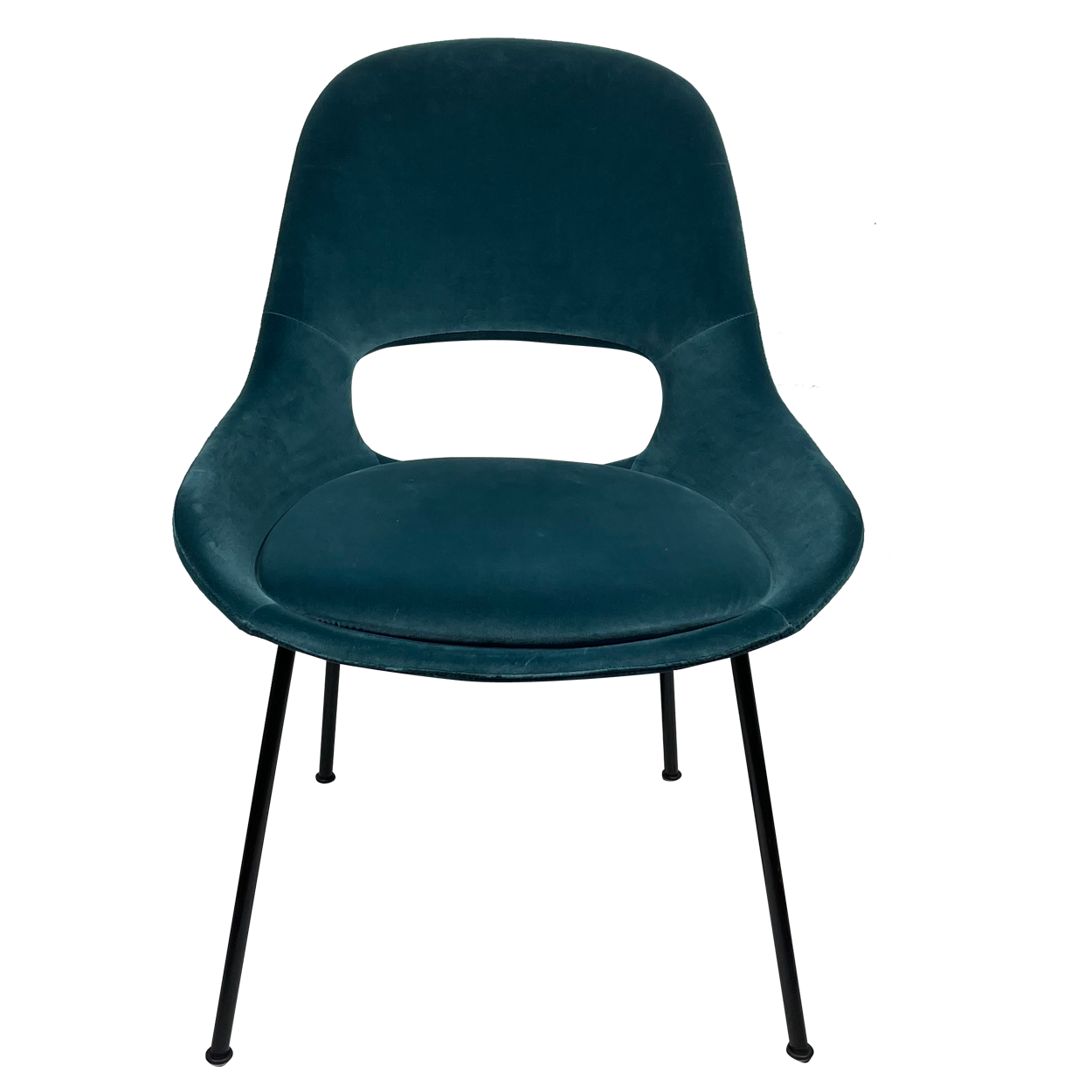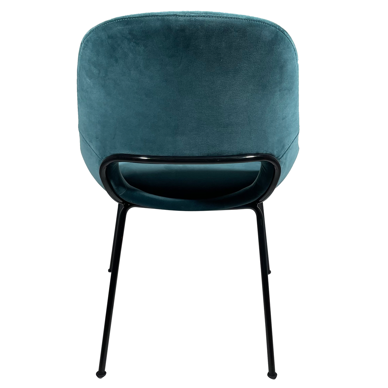 Die fließende Linie des Schwarzchrom-Gestells ME400 umhüllt den Rücken und betont das Gesamtkonzept des Stuhls, wobei die Leichtigkeit und Eleganz des Designs hervorgehoben werden. Dieses Gestell ergänzt nicht nur die Farbgebung des Velourstoffs, sondern bietet auch eine stabile und langlebige Struktur.